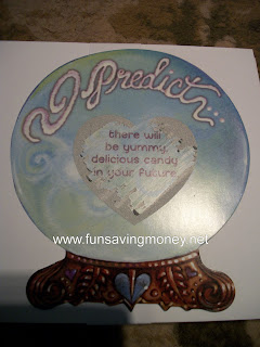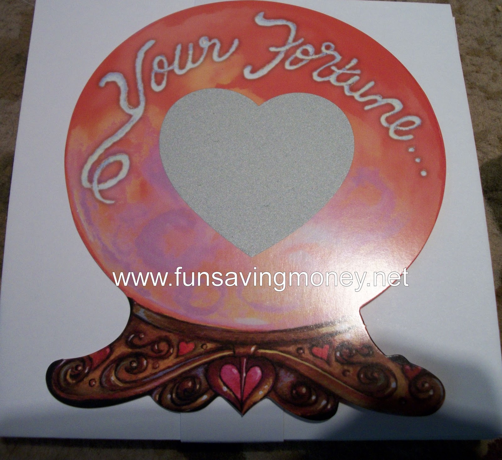 The scratch off part of the card is shaped like a heart. Its really easy to scratch off to read your fortune. The one below reads: there will be yummy delicious candy in your future.